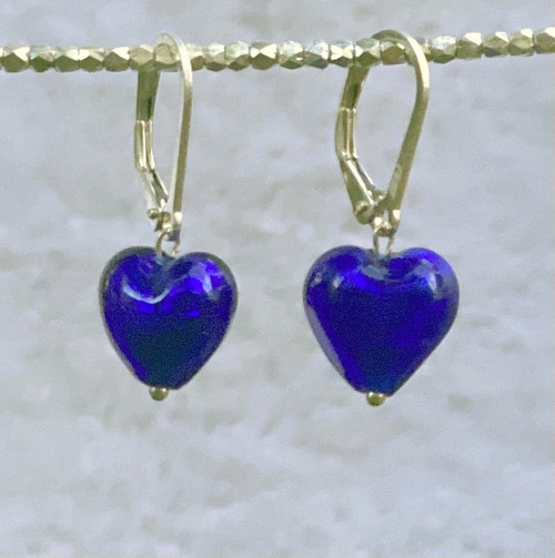 These brilliant cobalt blue Venetian glass hearts are lined with silver foil. They measure roughly 3/8" and gracefully dangle from the 5/8" nickle-free sterling silver European lever-backs. A perfect first pair of dangles and great for those who want to wear a tiny festive splash of color.