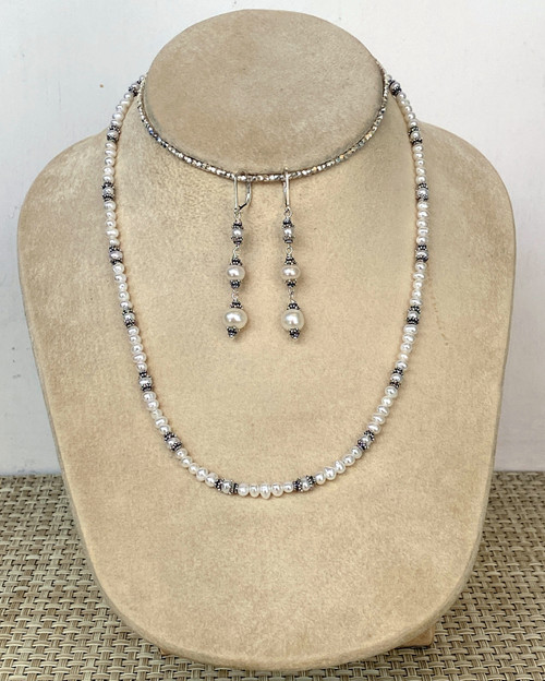 4mm irregular potato shaped freshwater pearls with silver accents and a charming sterling silver heart shaped clasp make for a delightfully versitile and delicate necklace. The default is 17 1/2", but I can make make it any length you like. The earrings shown are not included, but can be purchased on this website.