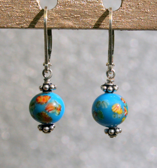 The glass beads in the center of these earrings were made in Japan in the 1950s in the style of Venetian "millefiori" glass. I've framed them between two hand-made sterling silver beads from Turkey. They are securely fastened to American-made sterling European leverbacks. The color is close to Pantone 2925C