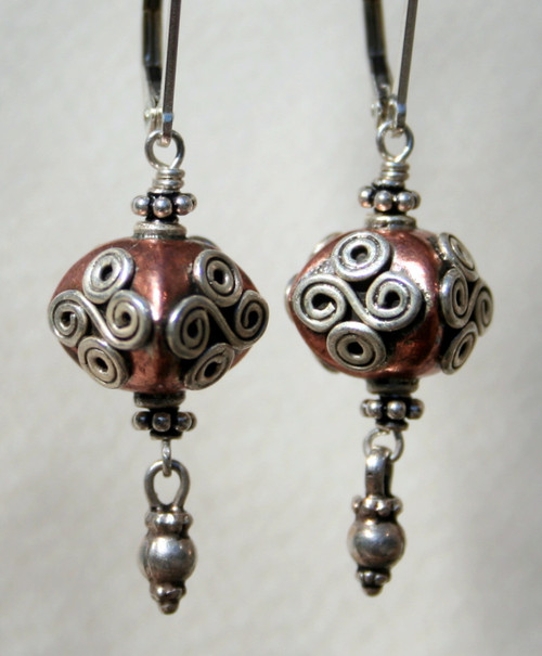 These double pyramid shaped pillow earrings are crafted from copper and sterling silver from Turkey. The beads are hollow, making them light enough to wear every day. I've secured the earrings with American-made sterling silver European leverbacks.