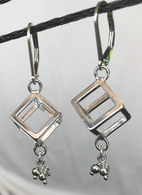 Sterling silver cubes with three sterling drops. Physically and visually light and airy. A contemporary twist on traditional Carnelian Knoll designs. As always, the sterling silver lever-back contains no nickel to reduce the chance of an allergic reaction.